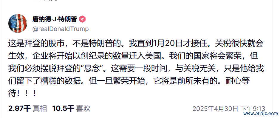 特朗普在Truth Social上发文称:“这是(前总统)拜登的股市,不是特朗普的。我直到1月20日才上任。”