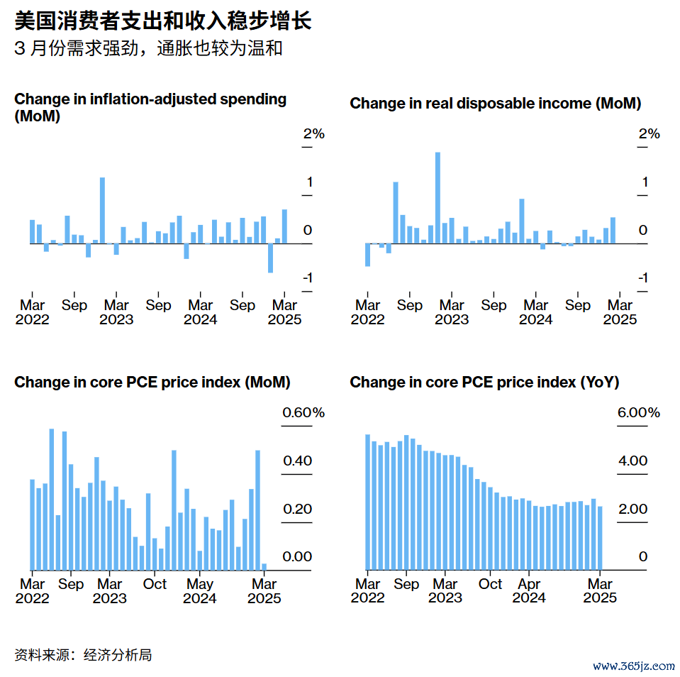 此外,美国3月消费者支出大幅增长,而关键的通胀指标则出现放缓,为在关税普遍推高物价前提供了一丝喘息机会。